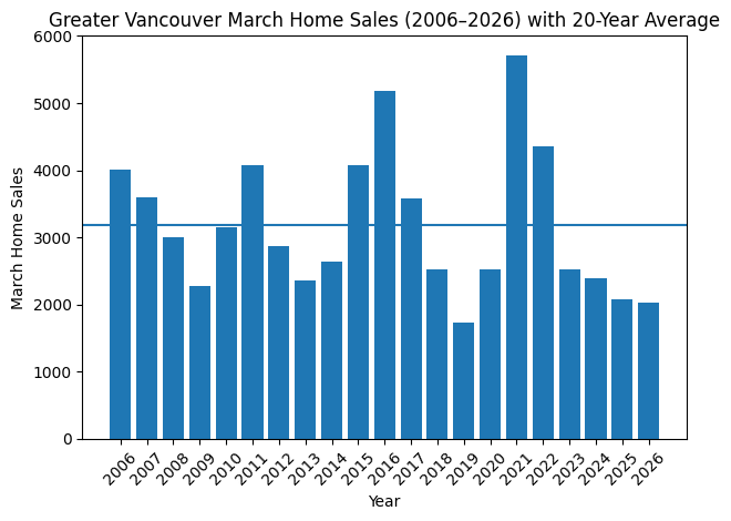 Greater Vancouver sales figures for the month of March show no improvement in sales activity. Home sales were down 3% from last year, coming in at their second lowest total in 20 years. Home sales are running 36% below their 20 year average!