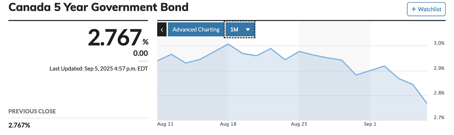 Here’s a look of the 5 year bond yield. Down nearly 25bps over the past month.