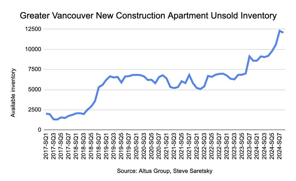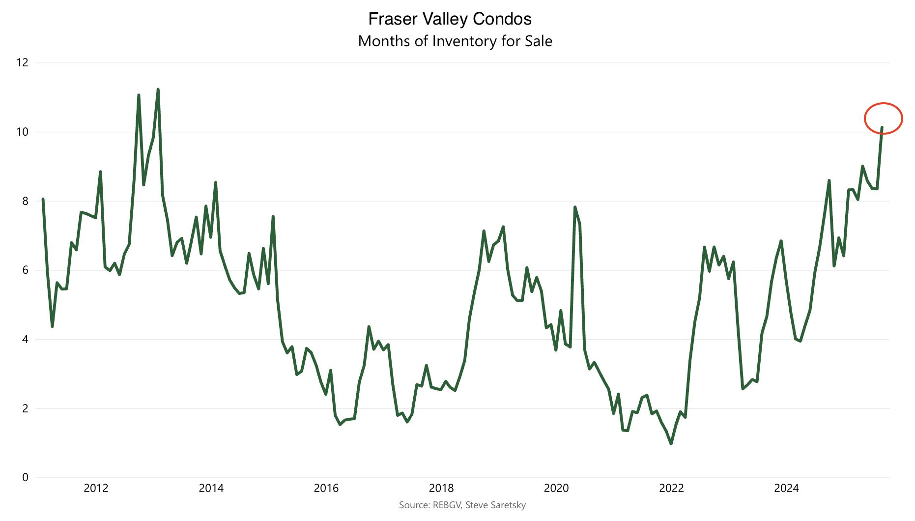 For example, in what used to be one of the frothiest markets, the Fraser Valley suburban condo market is now sitting on 10 months of inventory for sale. A nearly tenfold increase from the height of the bull market back in early 2022.