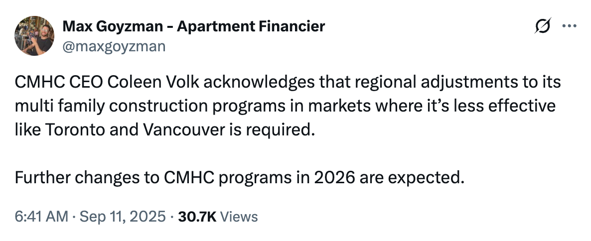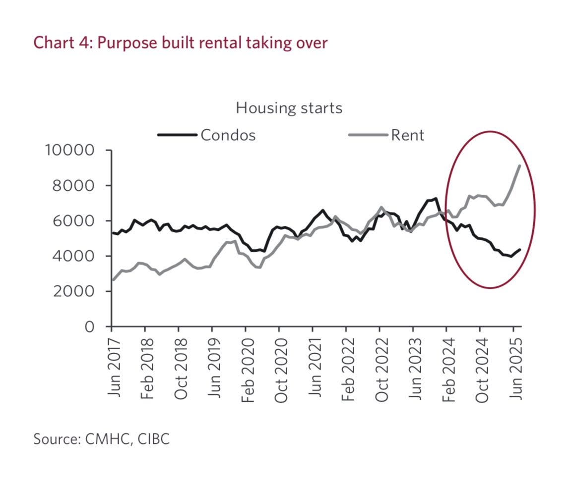 Meanwhile, CMHC is providing liquidity for developers through CMHC MLI Select financing, allowing otherwise dead pre-sale projects to switch to rental. If you need to keep the machine churning, building rental is better than building nothing at all.