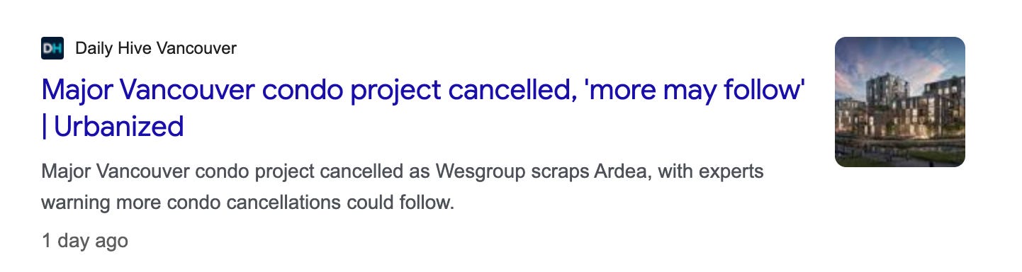 This week we learned Wesgroup (not to be confused with WestBank) has cancelled Ardea, a 204-unit waterfront project planned for its River District community in Vancouver, despite selling close to 50% of available units, per Altus Group.