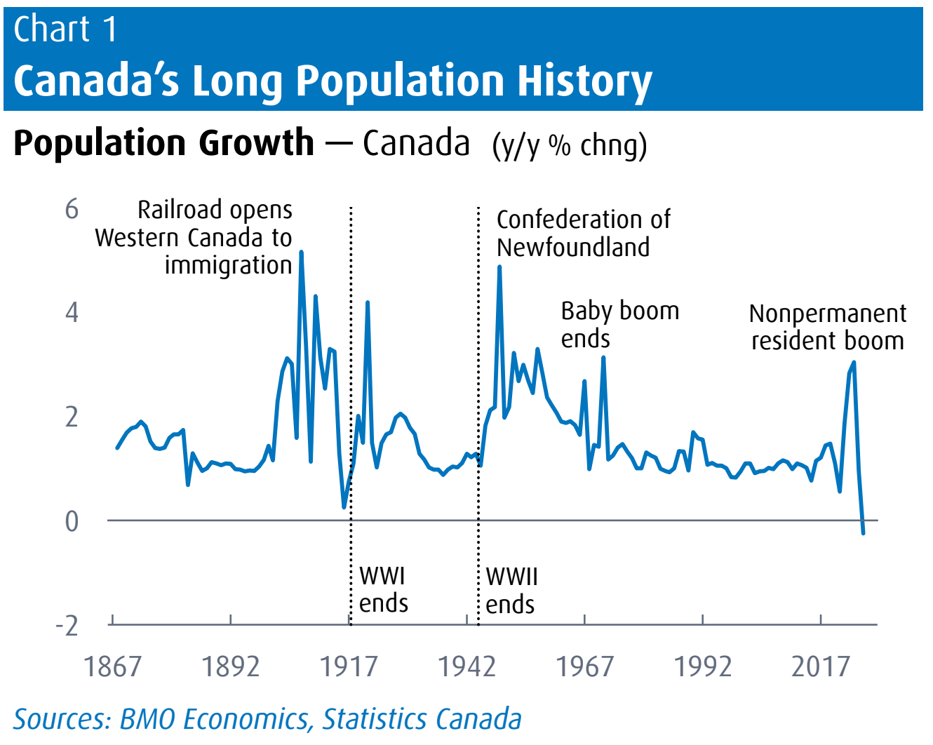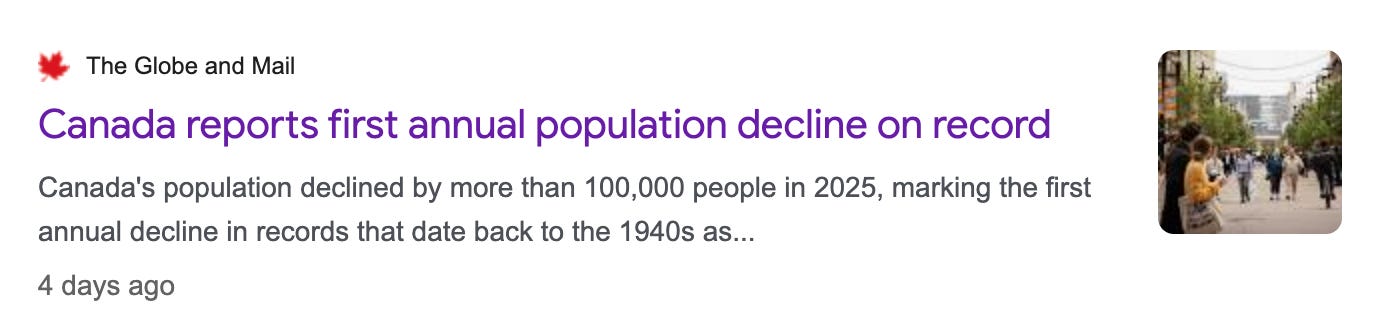 Canada’s population declined by more than 100,000 people in 2025, marking the first annual decline in records that date back to the 1940s. Led by a sharp drop in non-permanent residents (temporary workers and foreign students). Population growth has gone from 1.2 million per year, to -100,000.