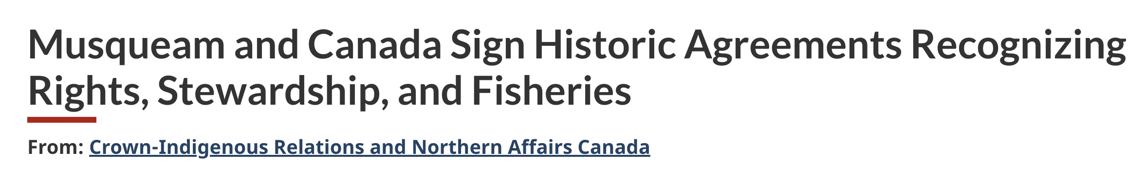 The Musqueam Indian Band and the Government of Canada signed a Rights Recognition Agreement where Canada recognizes Musqueam’s Aboriginal rights, including title, and sets up a framework to “incrementally” implement those rights through an ongoing nation-to-nation relationship.