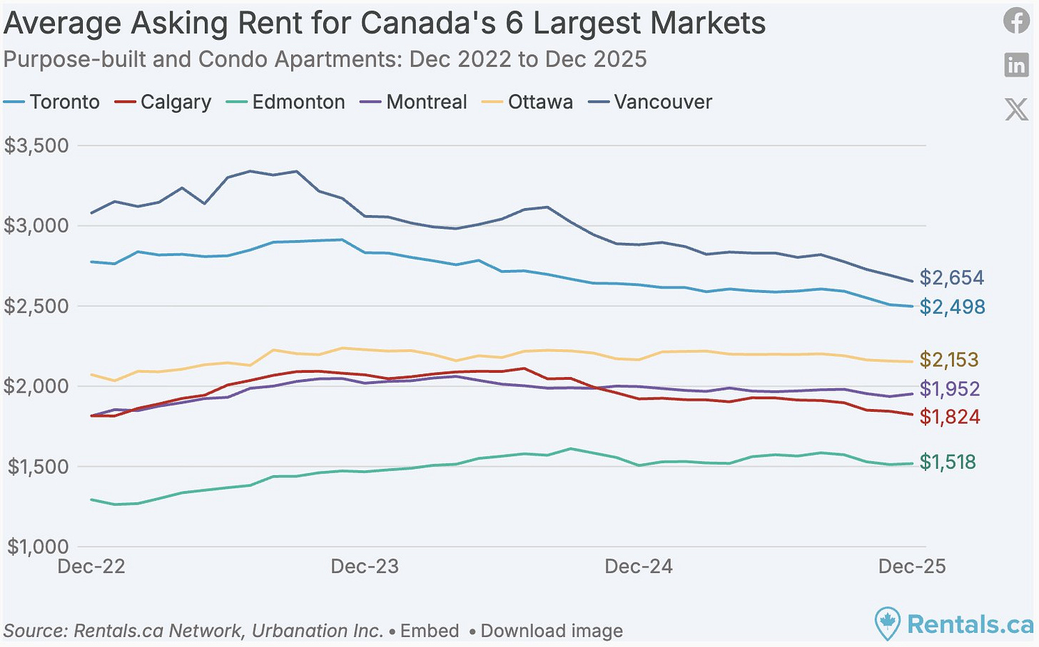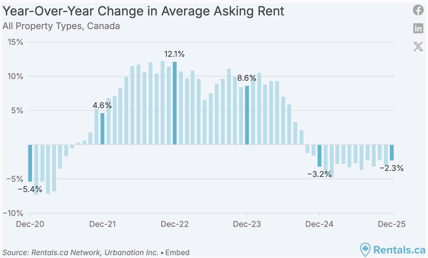 Asking rents in Canada fell again in December, falling for the 15th consecutive month according to Rentals.ca. Furthermore, December marked the slowest month for rental demand in two years, capping off five straight months of declining prospect counts.