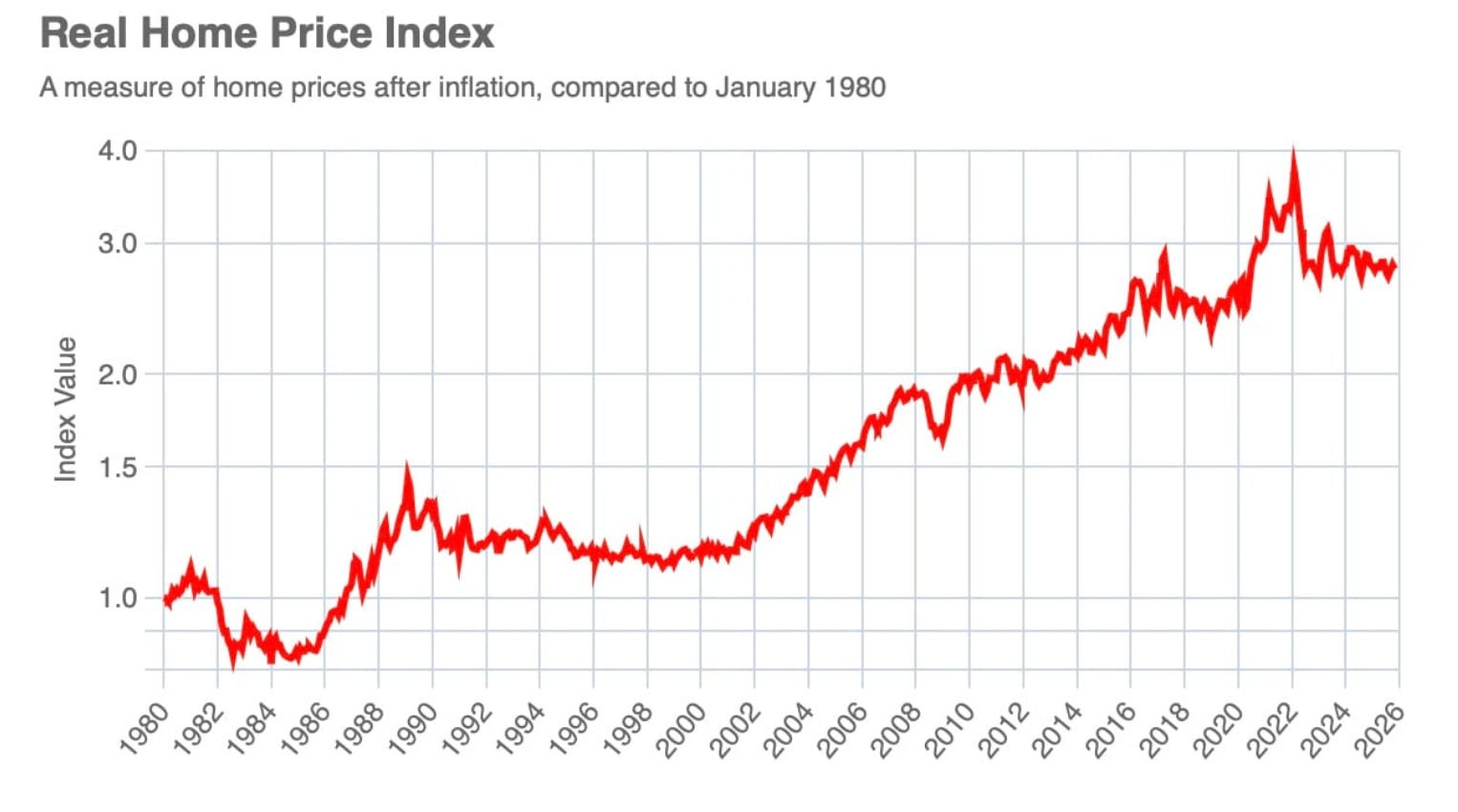 “While real estate prices are positive, keep in mind that inflation over that period has run at 3.7% annualized, leaving real home prices contracting. In fact, in real terms, home prices are now roughly unchanged from where they were 9 years ago.”