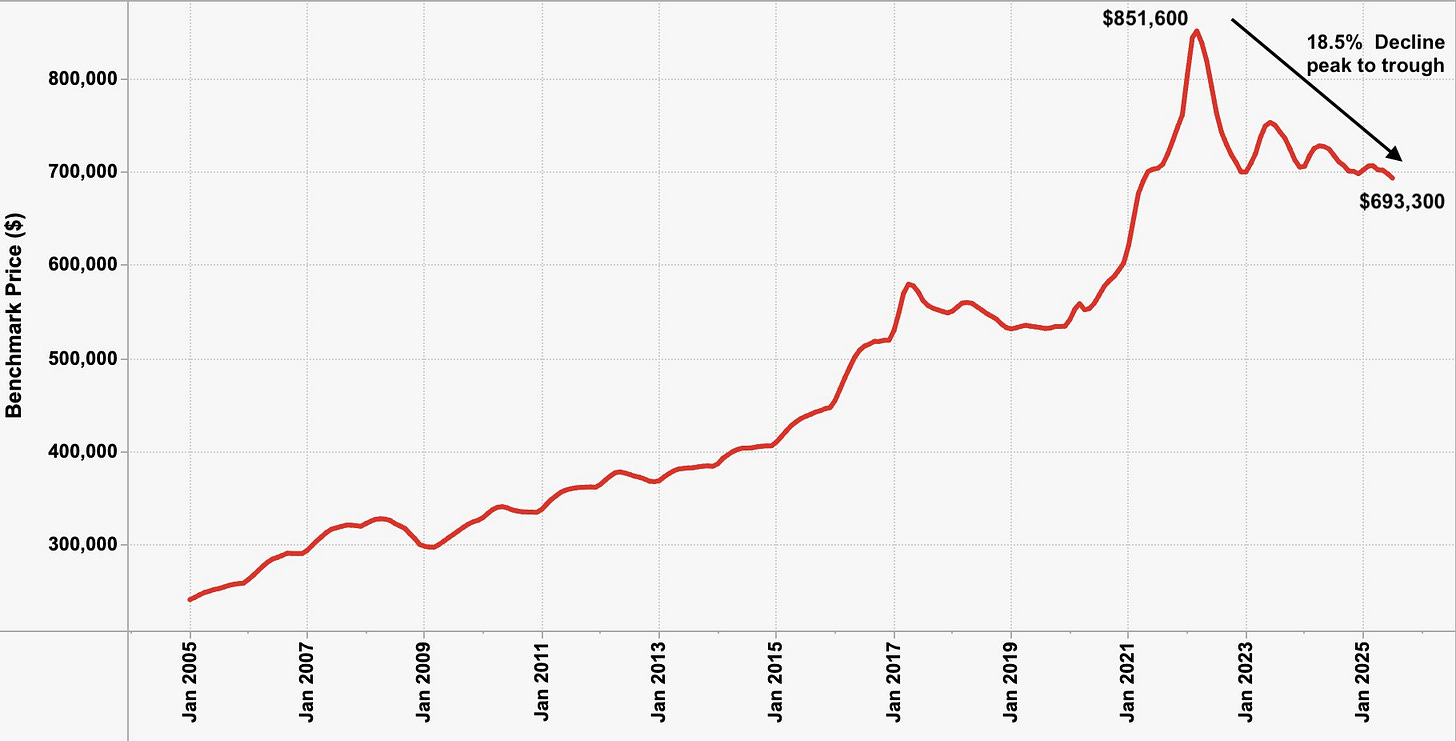 National home prices are now down 18.5% since peaking in March 2022, as per the CREA HPI. This is the sharpest drawdown in at least two decades, dwarfing the Global Financial Crisis which only endured a 9% drawdown to the national benchmark price.