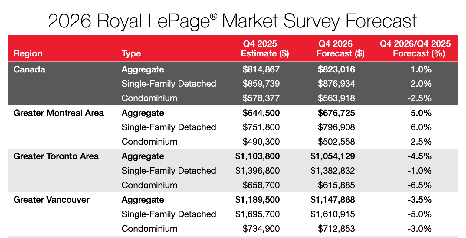 Royal LePage is calling for aggregate home prices in Vancouver to fall another 3.5% in 2026, and 4.5% in Toronto.